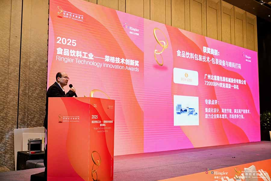 ????8月14日,“2025食品飲料行業——榮格技術創新獎”頒獎典禮在廣州隆重舉行。達意隆憑借72000BPH吹貼灌旋一體機,在眾多創新成果中脫穎而出,榮獲“技術創新獎”。